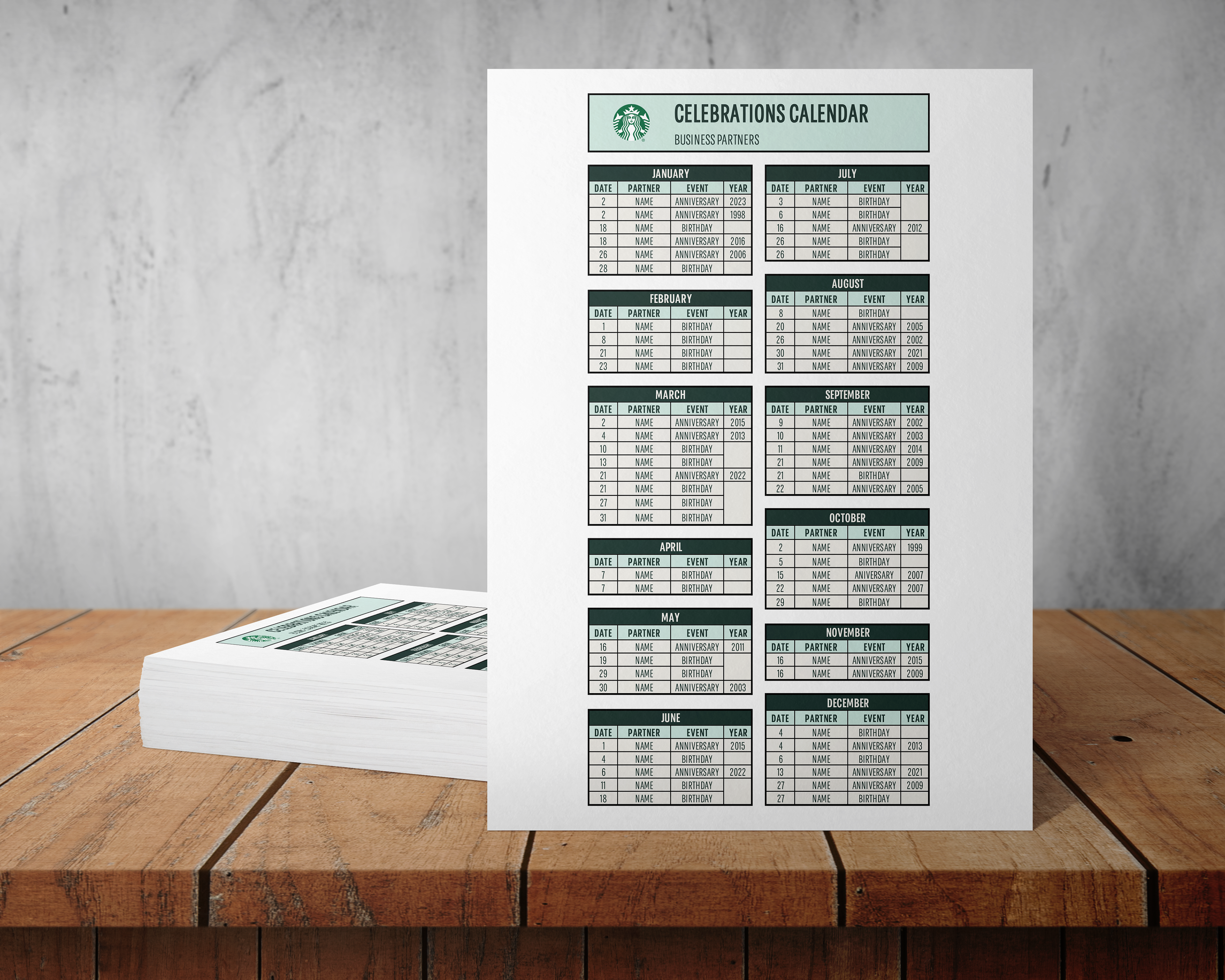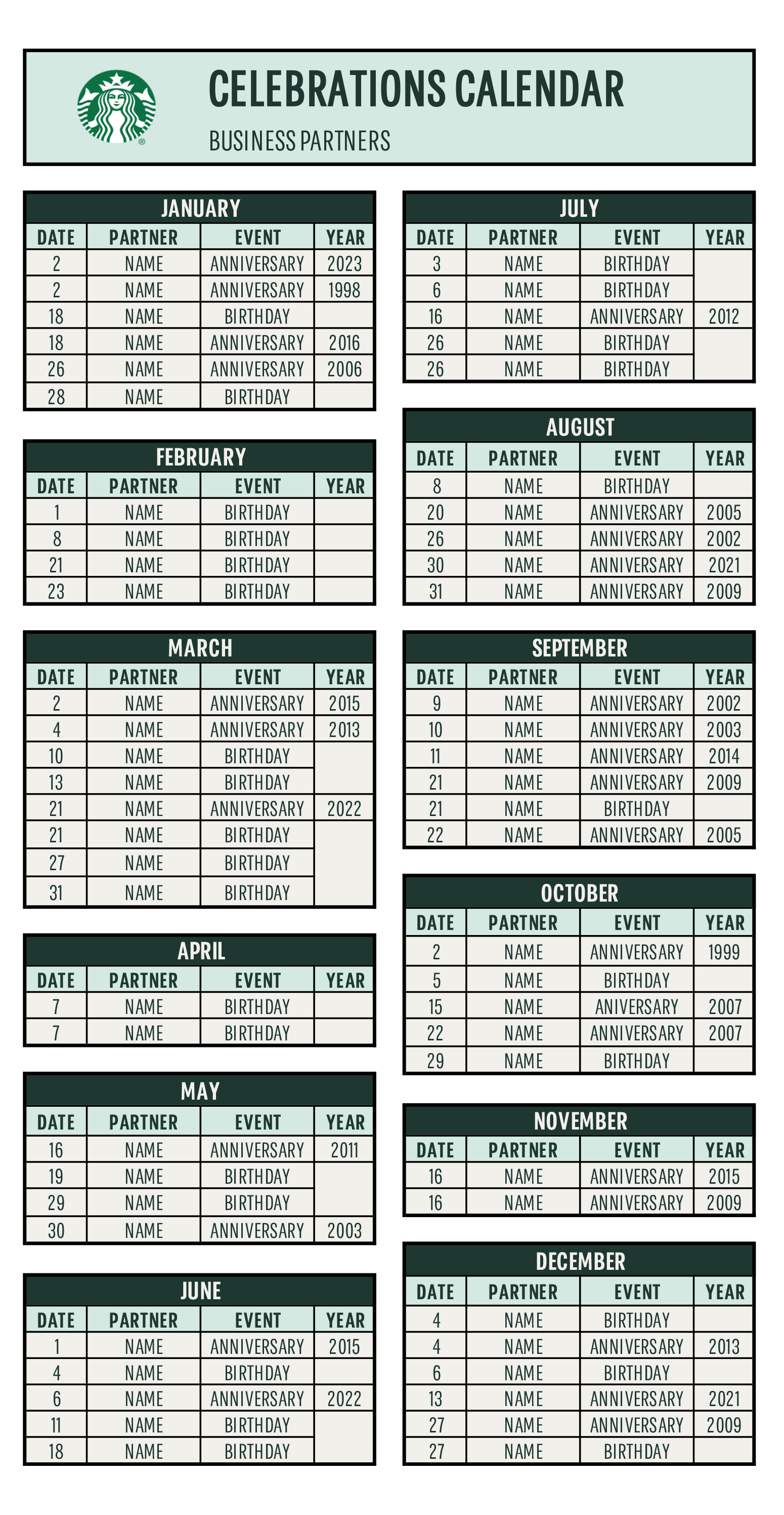Trouble remembering upcoming celebrations? No worries, have your admin sort birthdays and workplace anniversaries in this table for your quick reference.